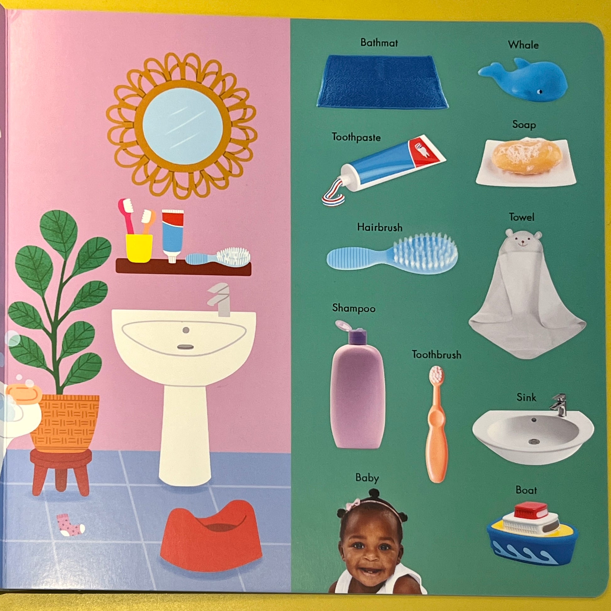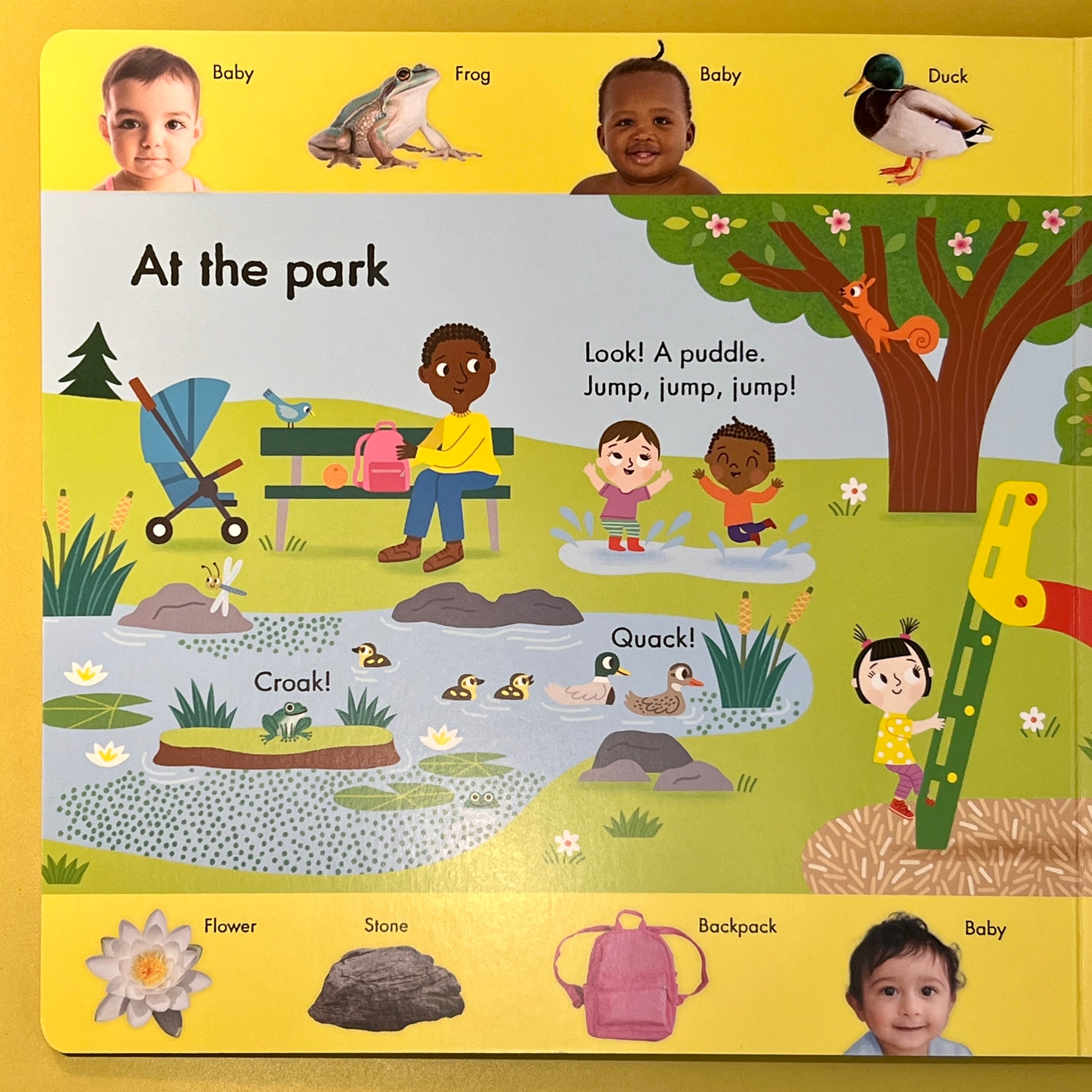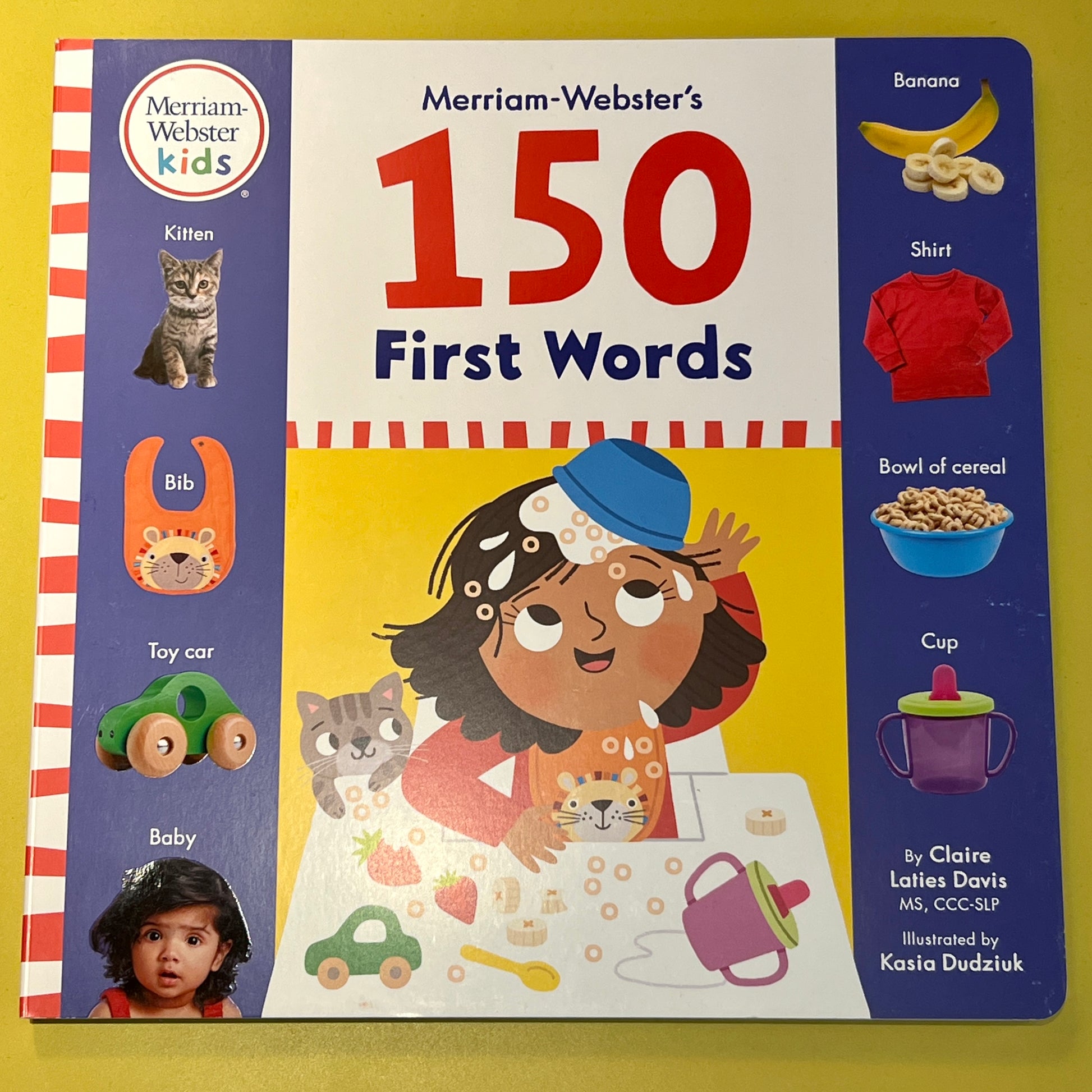 This oversized board-book (11x11) of 150 First Words is the perfect gift for the young reader in your life. Talk with your little one all day long with more than 150 helpful words and phrases that take you from sunrise to sunset. Learn words and phrases for everyday objects and activities that are woven around illustrations of mealtime, playtime, and other daily routines. Search-and-finds within every scene provide fun ways to connect with your baby. Created by the word experts at Merriam-Webster and sold to benefit Noah Webster's birthplace and boyhood home.