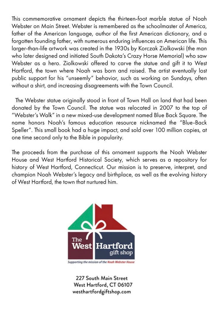 The proceeds from the purchase of this ornament supports the Noah Webster House and West Hartford Historical Society, which serves as a repository for history of West Hartford, Connecticut. Our mission is to preserve, interpret, and champion Noah Webster’s legacy and birthplace, as well as the evolving history of West Hartford, the town that nurtured him.