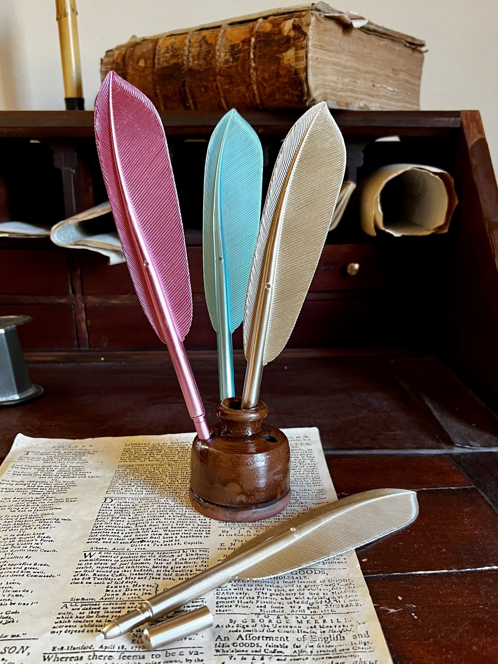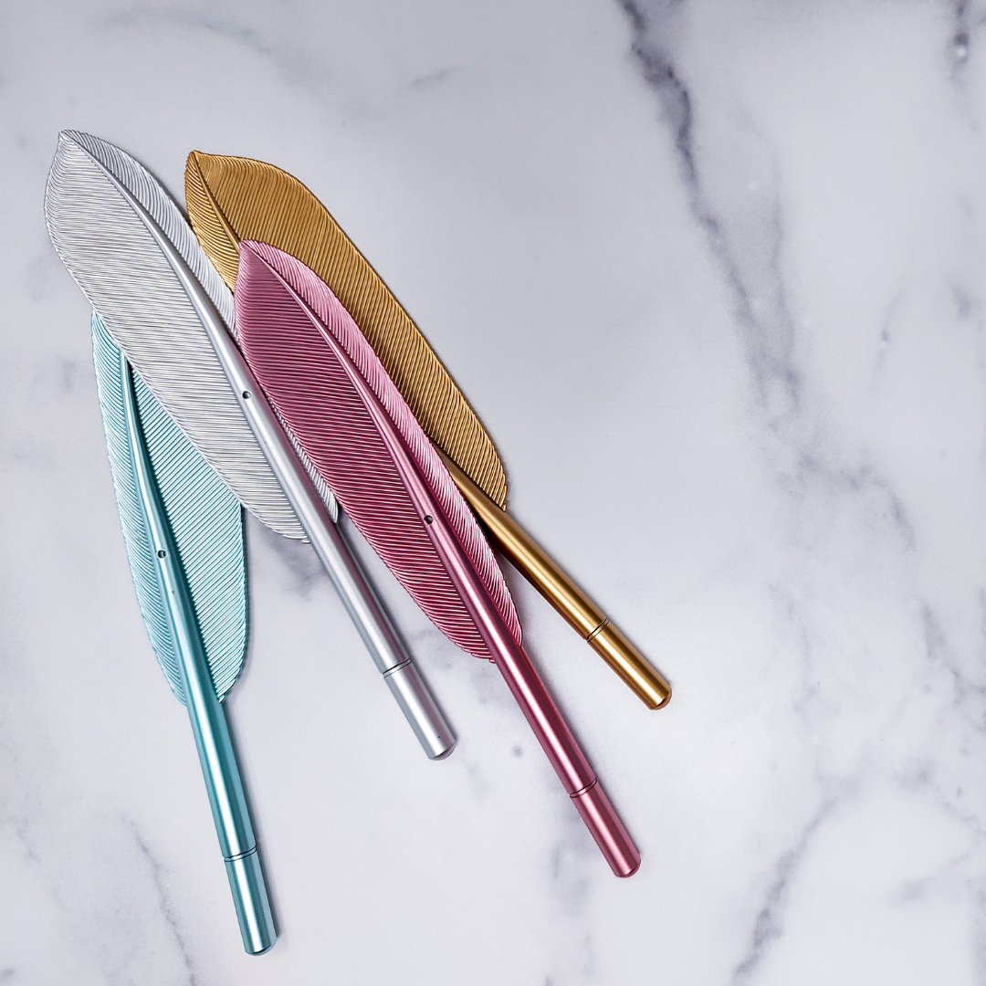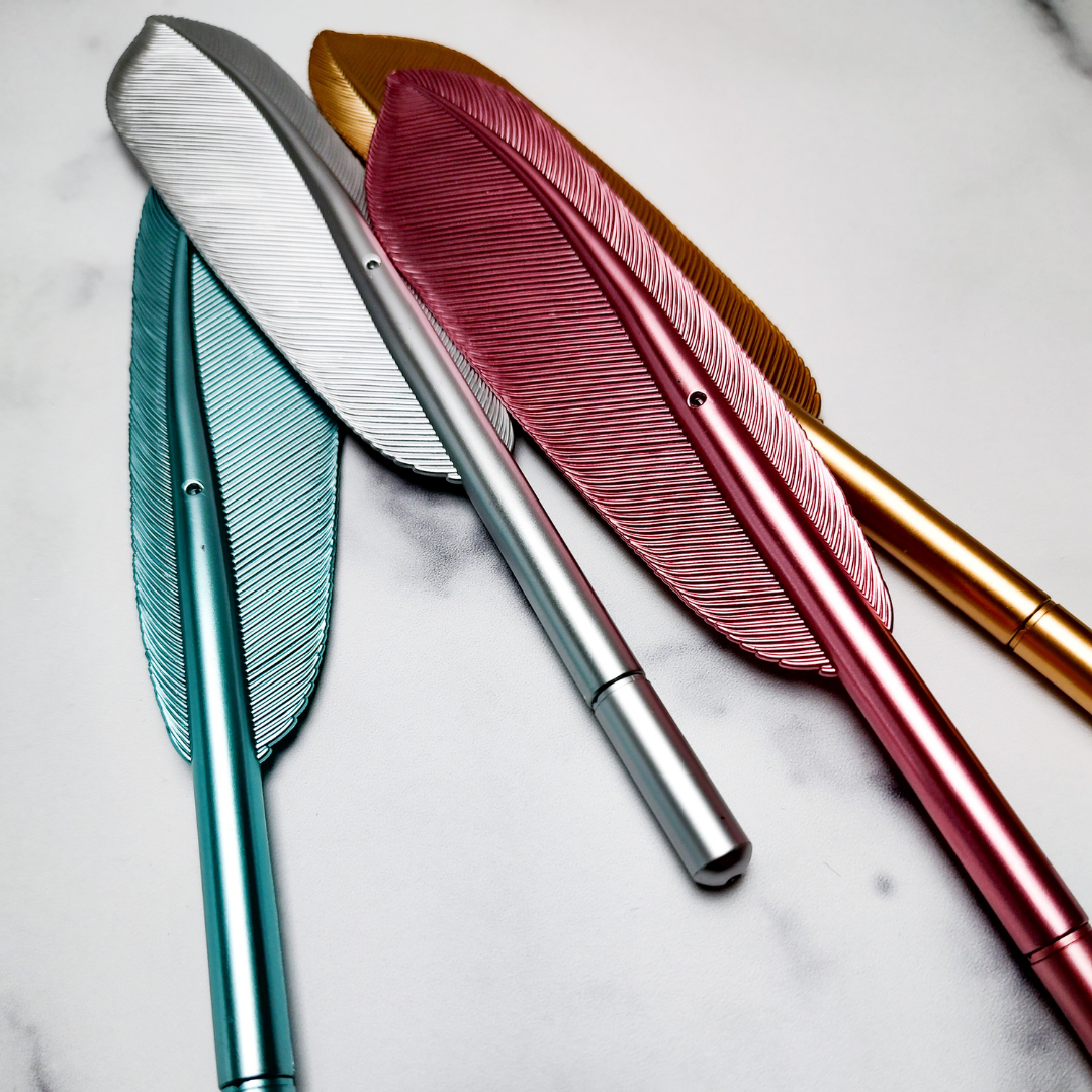 These 9 inch long metallic plastic quill pens are a fun and whimsical writing tool. The plastic feather design provides all the fun of using a quill and the ultra fine ballpoint pen tip offers a reliable flow of black ink. These pens are great gifts for students, teachers, graduates and writers. Add a little flair and fun to your tasks with a metallic quill pen. These pens are available in metallic gold, blue, pink and silver.