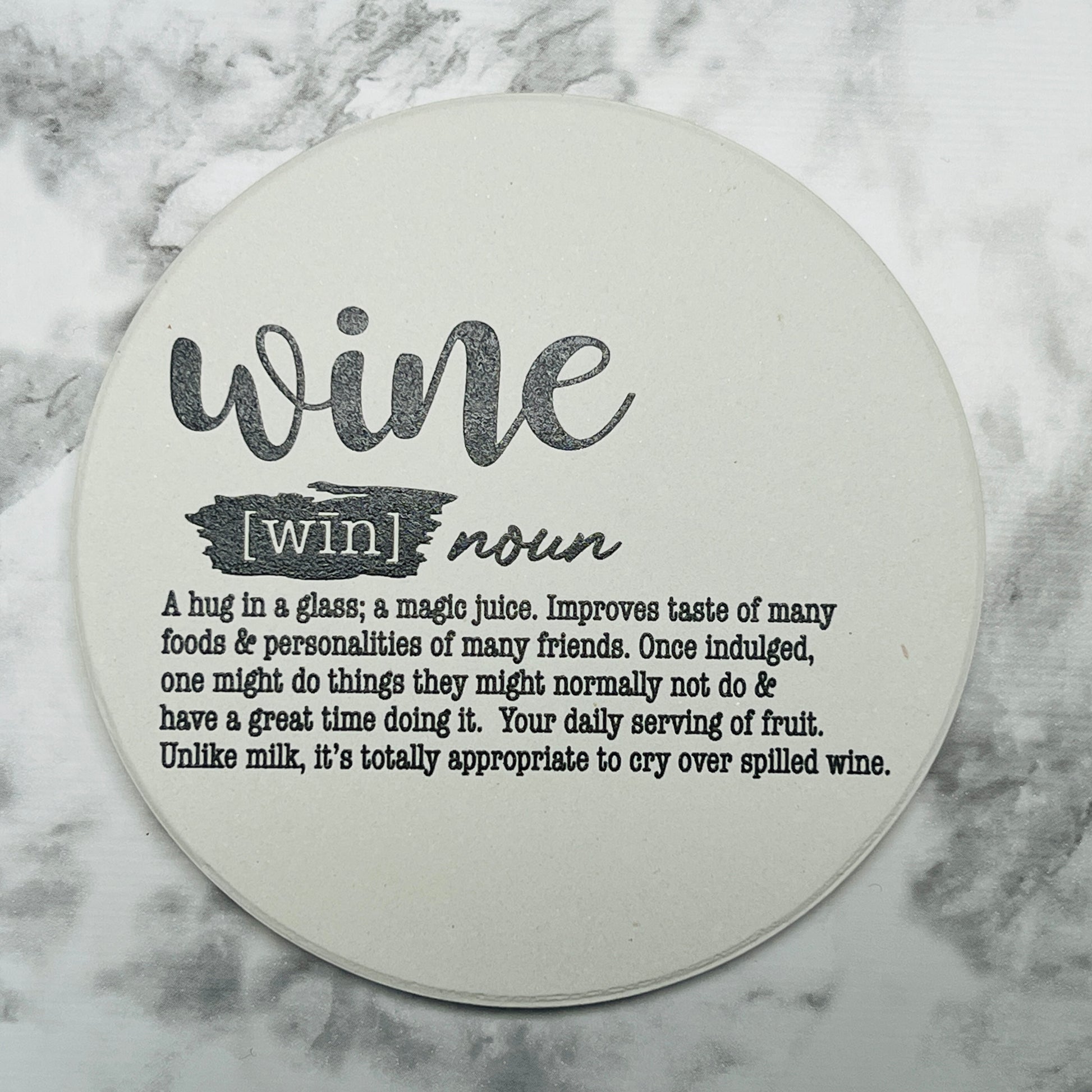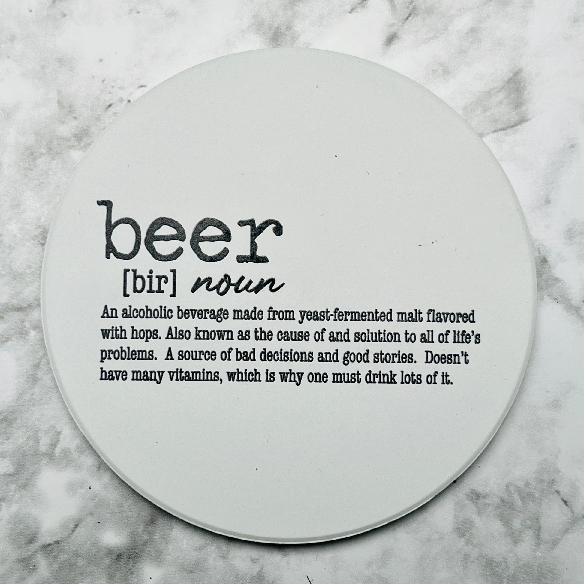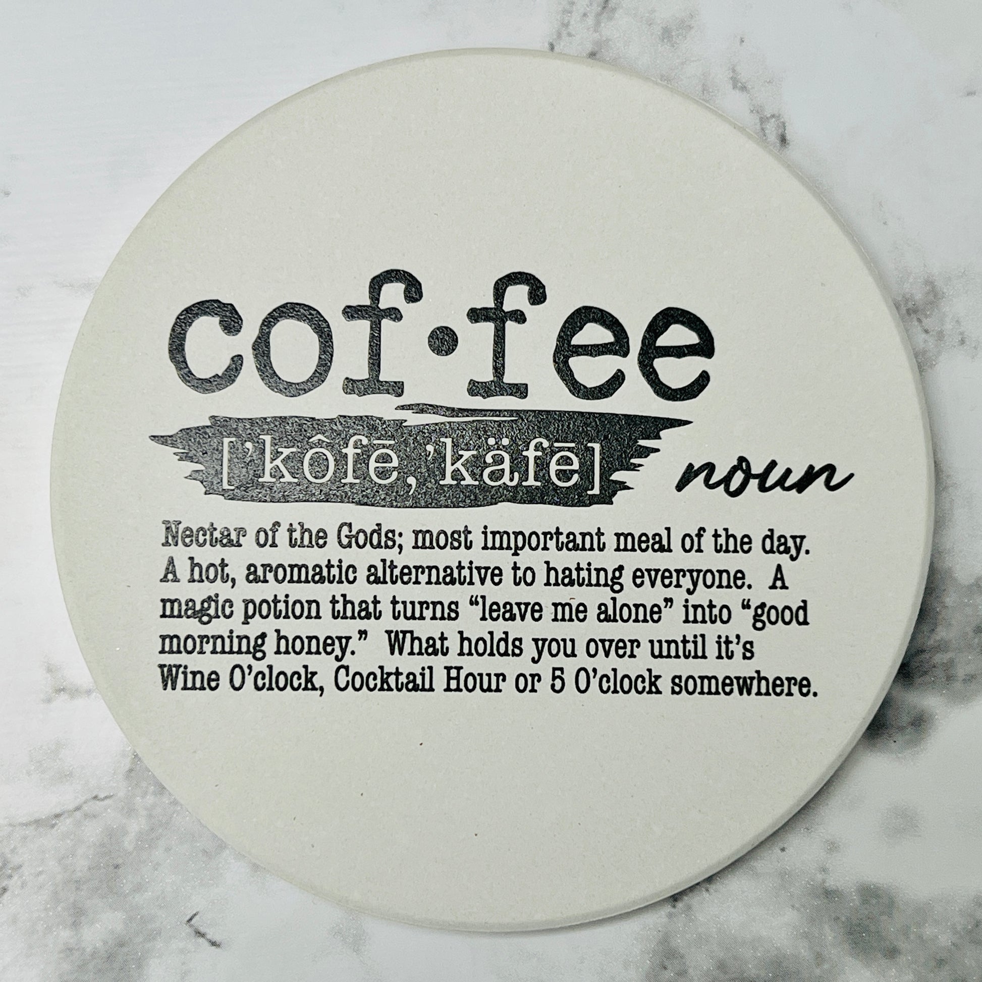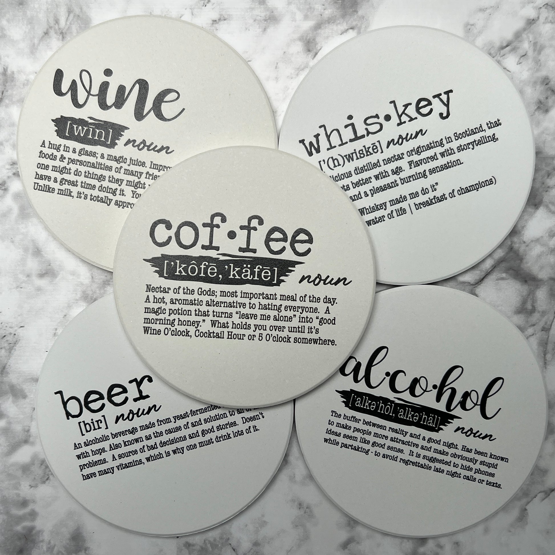 Redefine your beverage of choice with our humorous definition coasters. These ceramic and cork coasters are the perfect gift for anyone who starts their day with the "Nectar of the Gods" (Coffee) or finishes it off with "The Water of Life" (Whiskey). If you're looking for "The Solution to All Life's Problems" (Beer) or just a "Hug in a Glass" (Wine), we have you covered. Get a matching set or build your own when you pick your favorites.