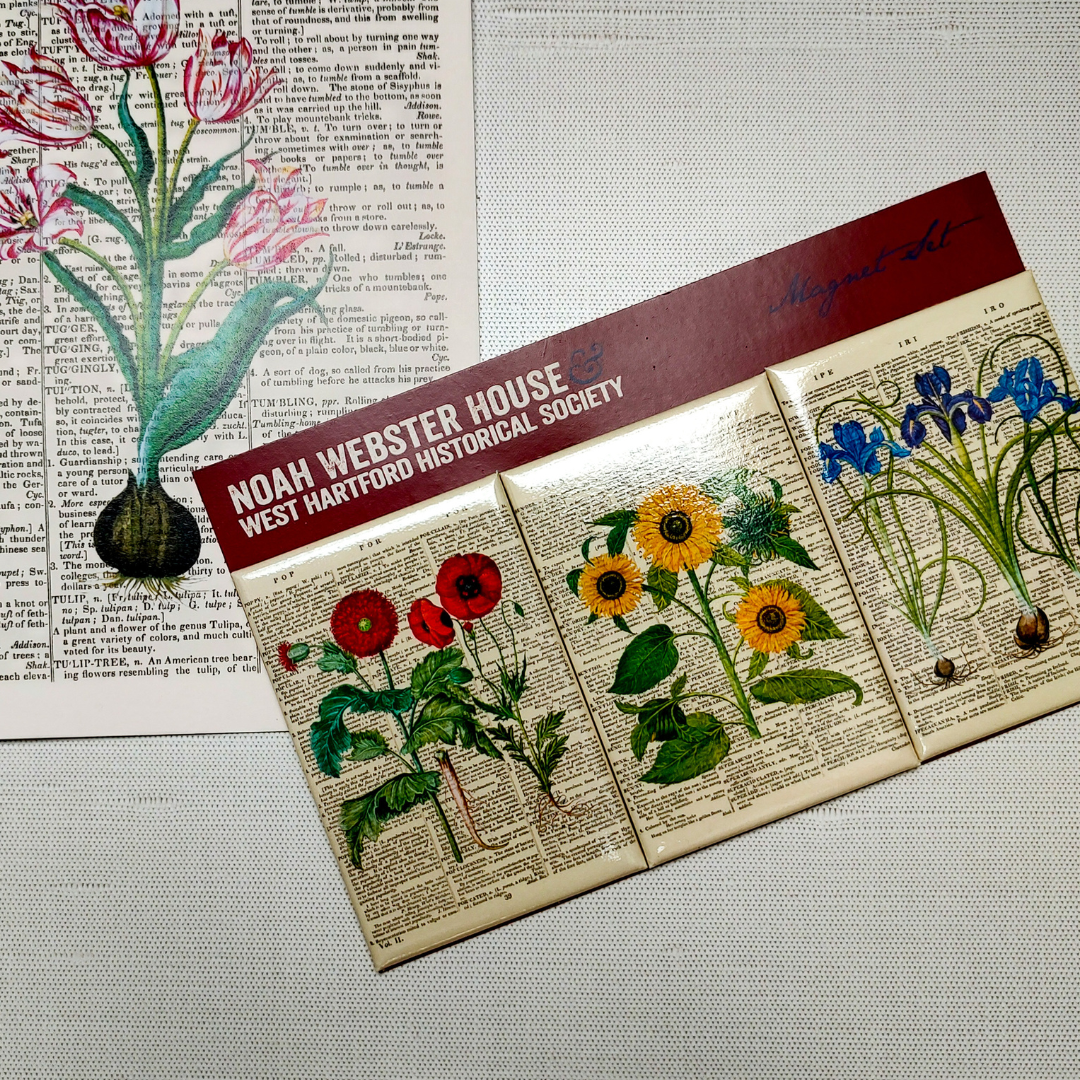 Share your love for language and beautiful flowers with this set of 3 magnets. This set of cards features 3 different designs of plants on dictionary pages. This set includes the sunflowers, irises, and poppies. Each flower is superimposed on the page from the dictionary that contained the definition for the plant displayed. The dictionary pages depicted are scans from Noah Webster’s 1828 dictionary. Each magnet is 2″ x 3.” This product comes in attractive packaging making it the perfect gift!