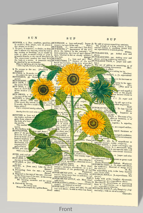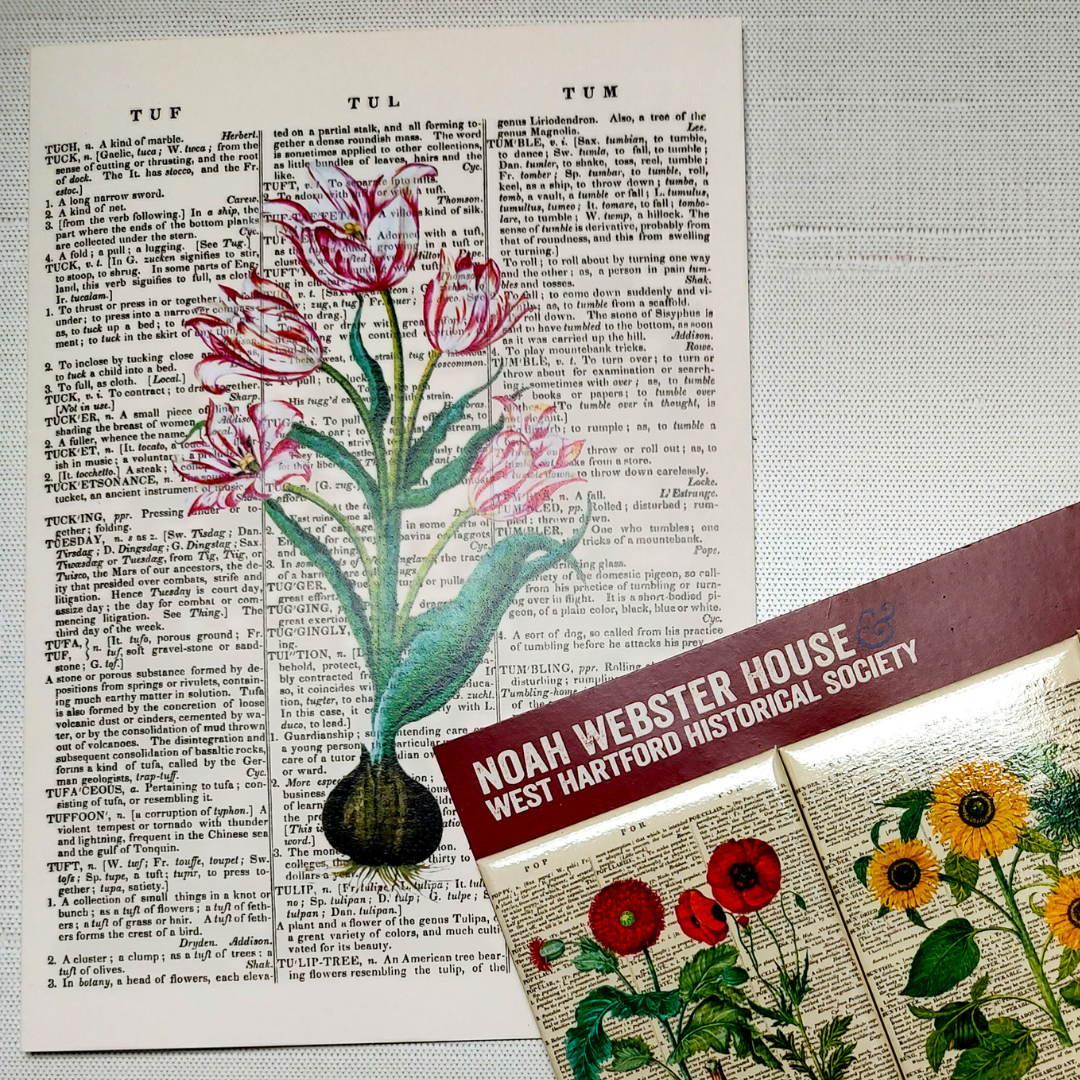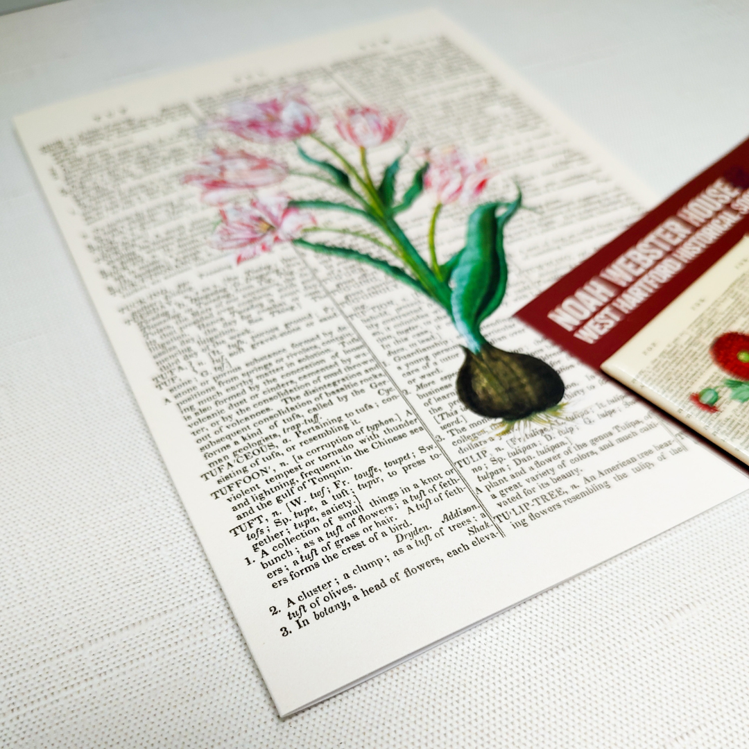 Share your love for language and beautiful flowers with this set of 8 notecards. This set of cards features 4 different designs of plants on dictionary pages. This set includes the sunflowers, irises, poppies, and tulips. Each flower is superimposed on the page from the dictionary that contained the definition for the plant displayed. The dictionary pages depicted are scans from Noah Webster’s 1828 dictionary. This notecard set contains 8 blank 5″ x 7″cards, with 2 of each different design, and includes 8 plain envelopes.