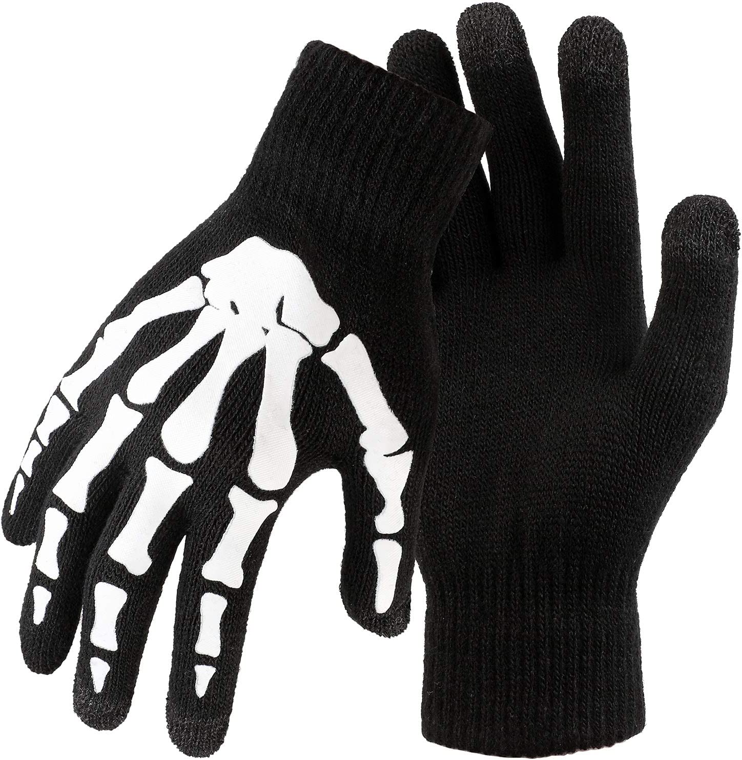 Pair of black gloves with skeleton print on the back of hands. Skeleton print glows in the dark. Pointer, middle and thumb fingers have smart phone friendly fingertips.