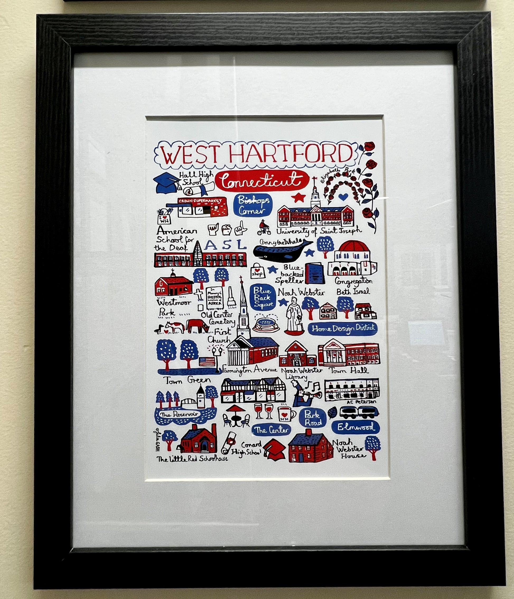 11″ x 14″ print of Julia Gash’s charming illustration of West Hartford landmarks, matted and ready to be framed. This colorful print will bring life to any room! Premium Crystal Packed with Foam Core Backer Board.