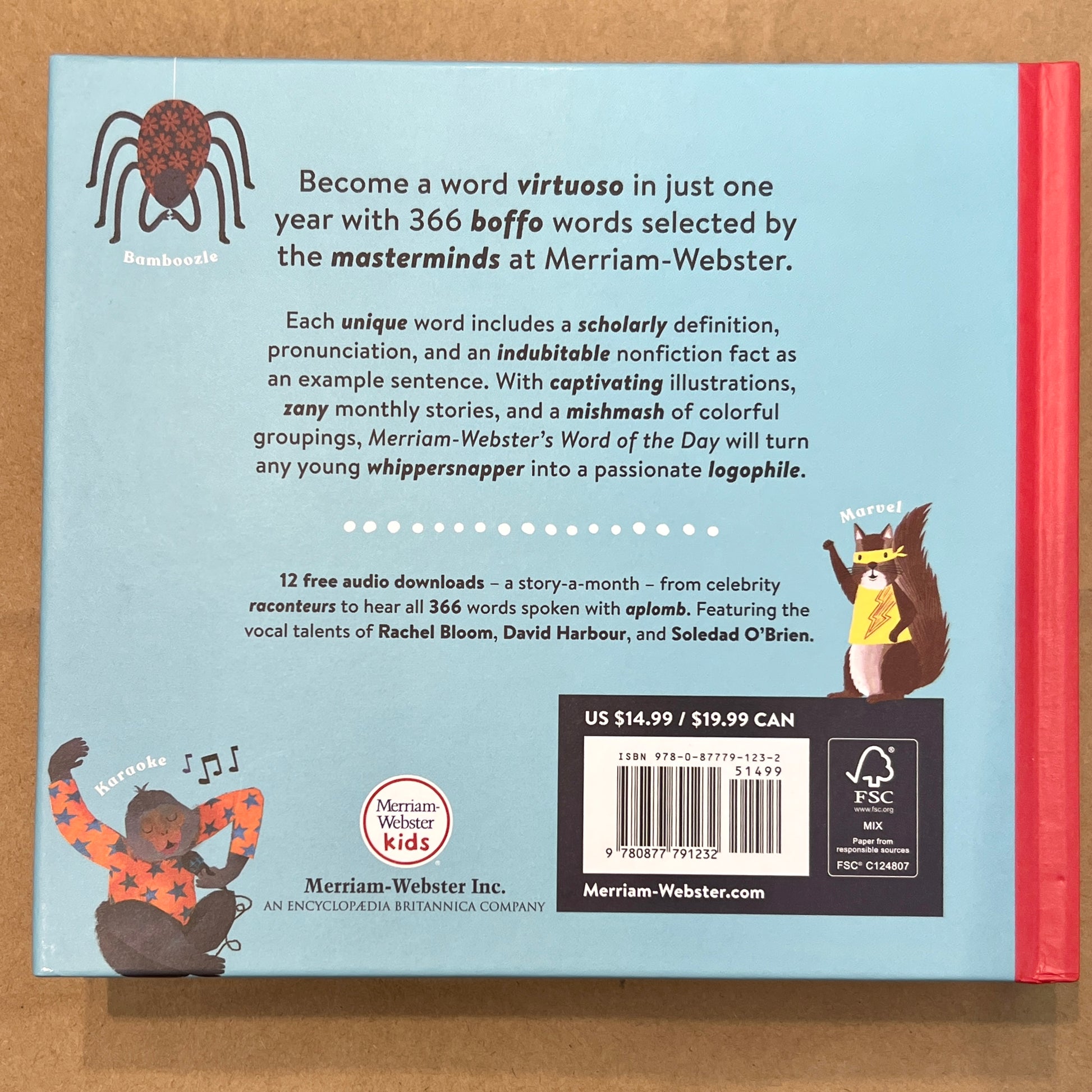 This captivating book has a whimsical word for every day of the year accompanied by beautiful illustrations. Pick your favorite word from the 366 elevating utterances, their definitions will stretch your cranium and tickle your humerus. Each unique word includes a scholarly definition, pronunciation, and an indubitable nonfiction fact as an example sentence. With captivating illustrations, zany monthly stories, and a mishmash of colorful groupings, Merriam-Webster's Word of the Day will turn any young whippersnapper into a passionate logophile. Includes access to 12 free audio downloads of a story a month from celebrity raconteurs to hear all 366 words spoken with aplomb. Featuring the vocal talents of Rachel Bloom, David Harbour, and Soledad O'Brien.